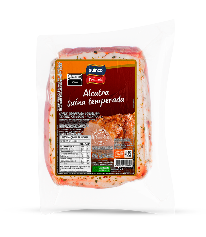 Carne Temperada Congelada de Suíno sem Osso Alcatra. INGREDIENTES: Carne Suína, água (12,6%) , sal, açucar, proteína de soja (Agrobacterium thumefaciens e Bacillus thuringiensis) (0,02%), especiarias: cenoura granulada, salsa em flocos, orégano em flocos, pimenta vermelha em flocos, pimentão em flocos, alho em pó, cebola em pó, regulador de acidez: lactato de sódio, citrato de sódio, estabilizante: tripolifosfato de sódio, antioxidante: eritorbato de sódio, realçador de sabor: glutamato monossódico, acidulante: ácidos orgânicos, conservantes: nitrito de sódio, aroma natural de especiarias, espessante: carragena, corante: carmim de cochonilha. NÃO CONTÉM GLÚTEN, CONTÉM SUBSTÂNCIA QUE ESTIMA SABOR, CONTÉM AROMATIZANTES, ALÉRGICOS: CONTÉM DERIVADOS DE SOJA.
